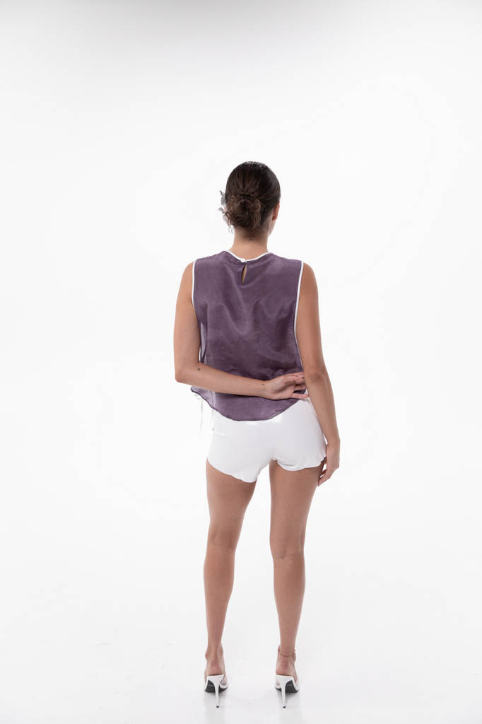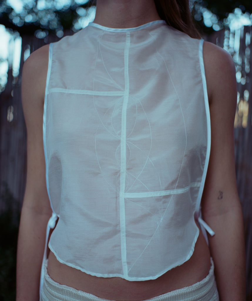 inspired by vineta’s sacred line work, the harmony top features traditional bojagi-stitched grids that serve as a blueprint for free-motion silk embroidery. these delicate stitches trace harmonic proportions, aligning geometry abstracted from shells and the human body — an intentional exploration of the the inherently divine connections between the two subjects.